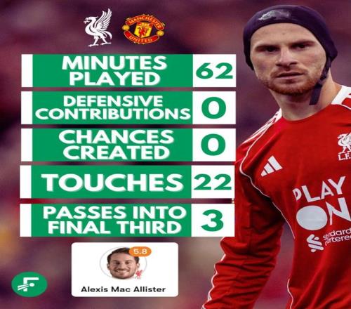 但在2025/26赛季,麦卡利斯特的发挥形同梦游。对阵曼联,他踢了62多分钟,仅22次触球、13脚传球、6次丢失球权——对一名中场核心来说,数字触目惊心。更让人咋舌的是,他0对抗成功,迅速成为众矢之的。一位利物浦博主在X上直言他是“队里最被高估的球员”,“在禁区到禁区之间慢得像快40岁的球员”。