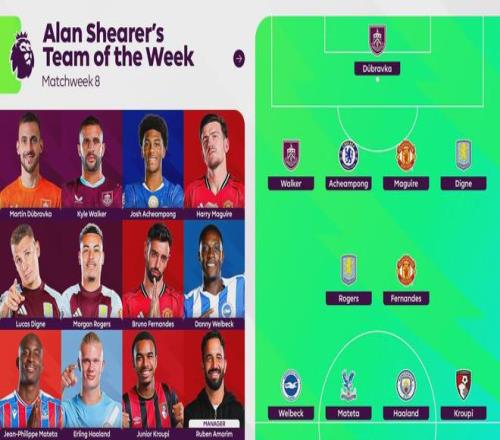 前锋:维尔贝克(布莱顿)、马特塔(水晶宫)、哈兰德(曼城)、克鲁皮(伯恩茅斯)
