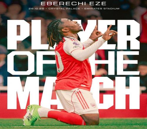 赛后,阿森纳官方也宣布,埃泽当选本场比赛全场最佳球员。
