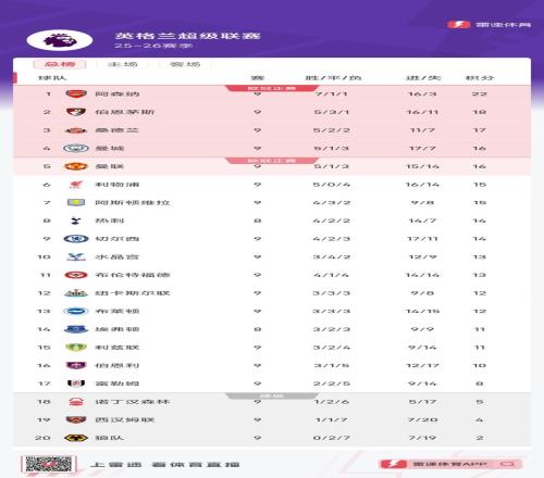 雷速体育10月27日宣 新赛季英超联赛来到第9轮,阿森纳继续领跑积分榜,但在积分榜紧追阿森纳的却不是利物浦、曼城、切尔西等豪门,而是伯恩茅斯、桑德兰。