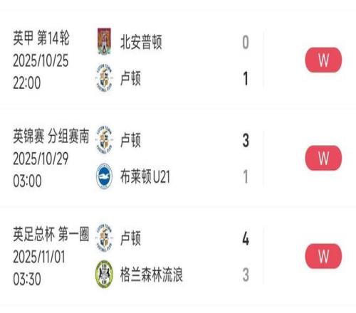 在此前的两场比赛中,卢顿镇先是客场1比0力克北安普顿,随后又在英锦赛中以3比1击败布莱顿U21队。加上本场足总杯的胜利,球队在最近三场比赛中狂轰8粒进球,进攻端焕然一新,展现出明显的战术进步和士气提升。