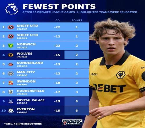 4. 狼队(25-26赛季) 2分 净胜球-15