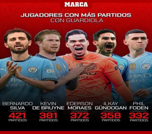 瓜迪奥拉麾下球员出场次数TOP5