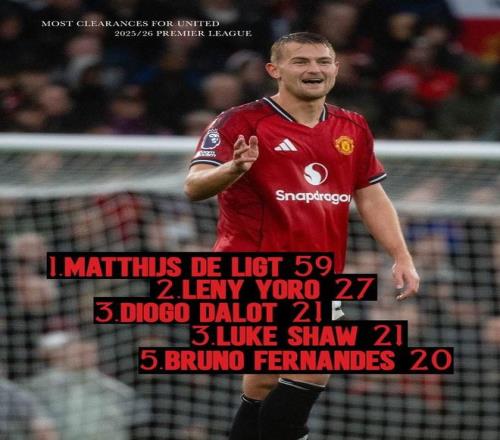 北京时间11月11日,曼联官方统计出了本赛季英超前11轮过后他们队内的解围榜,德利赫特以59次解围高居第一,比排名第二的约罗多出了32次。队长布鲁诺-费尔南德斯也进入榜单的前五位。