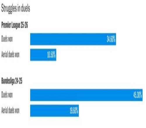 本赛季在英超,他的对抗成功率仅为35%(空中对抗成功率为11%),而相比之下,上赛季在德甲的成功率为45%(空中对抗为20%)。换句话说,维尔茨尚未适应英格兰足球在身体对抗强度上的提升。