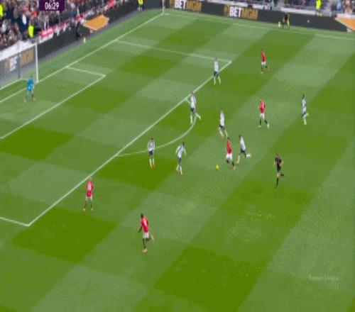 虽然曼联在进攻端的布置在理论上稍有问题,库尼亚和阿玛德-迪亚洛在各自位置上的表现不足很清晰,导致上半场的反制能力没能拔到理论上的最高值,但曼联还是先进一球,而且线路上恰好是右路的阿玛德-迪亚洛传给左路的姆贝乌莫: