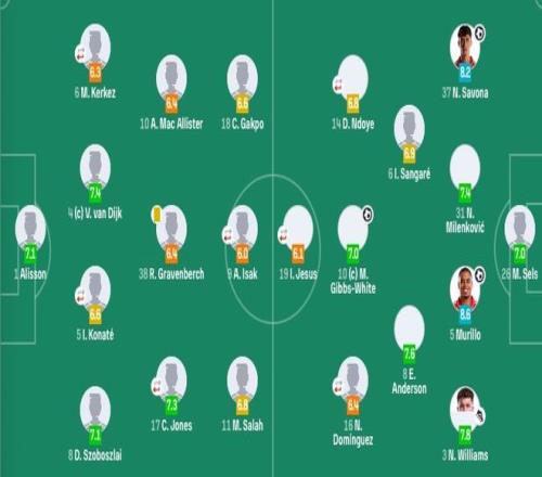 诺丁汉森林首发:26-泽尔斯、37-萨沃纳、5-穆里略、3-内科-威廉姆斯、31-米伦科维奇、6-桑加雷、8-E-安德森、10-吉布斯-怀特、16-多明戈斯(61'21-哈钦森)、14-恩多耶(86'7-奥多伊)、19-伊戈尔-热苏斯(86'22-耶茨)