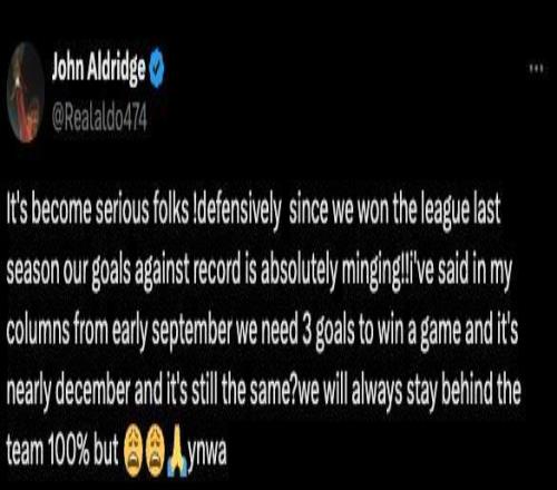 利物浦旧将奥尔德里奇在社交媒体平台上连发多条帖文,点评斯洛特执教下利物浦近期的糟糕状态。这番话是在主场0-3不敌诺丁汉森林的背景下发出的。