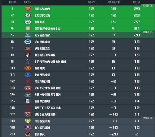 目前,英超的形势就是阿森纳一骑绝尘领跑,其他球队则陷入乱战。12轮过后,第2位的切尔西距离第12位的利物浦,只有5分的差距。1场比赛胜负,都可以让排名发生巨大变化。