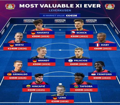 北京时间11月30日,德转列出了勒沃库森历史最贵的11人阵容,2024年身价达到1.4亿欧元的维尔茨以及2019年身价达到9000万欧元的哈弗茨领衔。