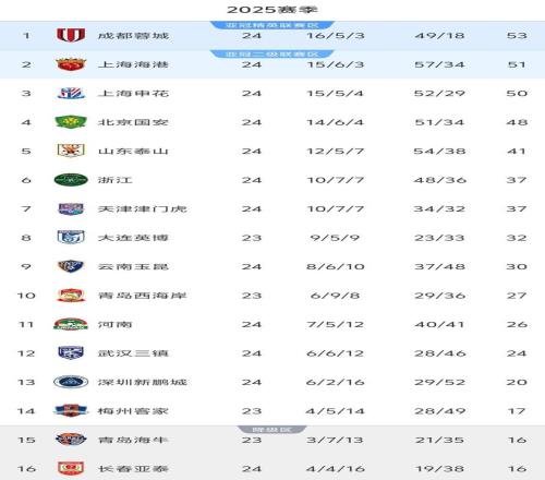 24轮过后,争冠集团逐渐拉开分差但竞争仍旧激烈,前3球队积分均突破50分,成都蓉城53分继续领跑,上港以2分之差位列次席,申花则跌到第3,北京国安排在第4。