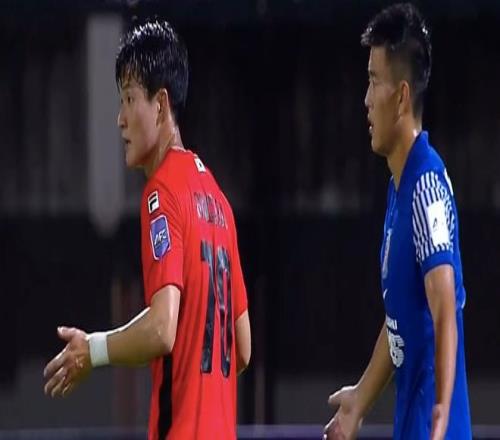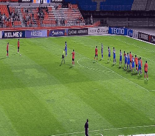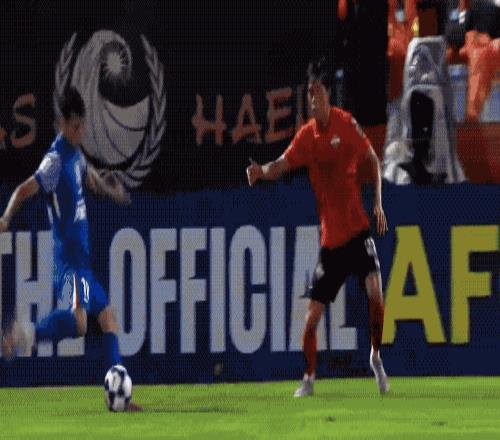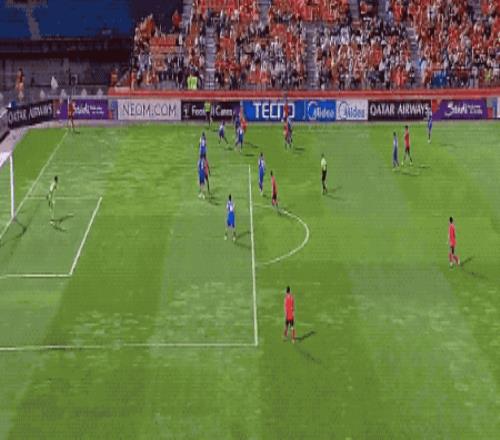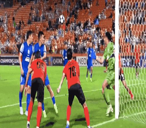 第32分钟,江原FC获得前场任意球,后卫赵炫泰包抄铲射,皮球击中边网。