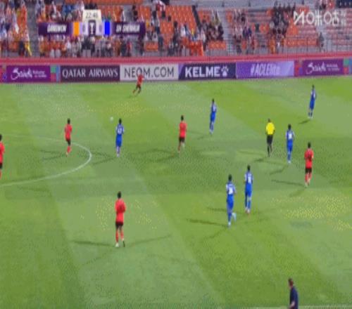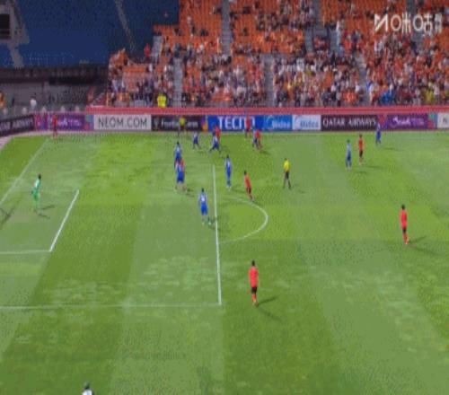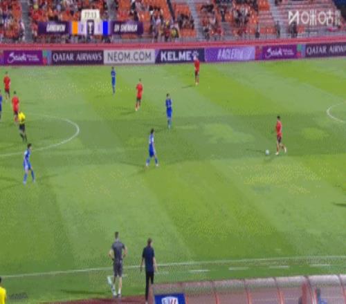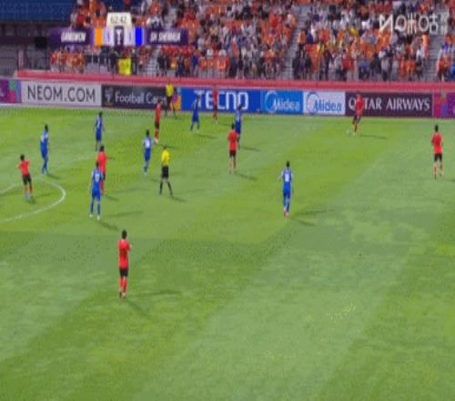 第30分钟,江原FC右路低平球往门前传,皮球被蹭了一下后,被鲍亚雄得到↓