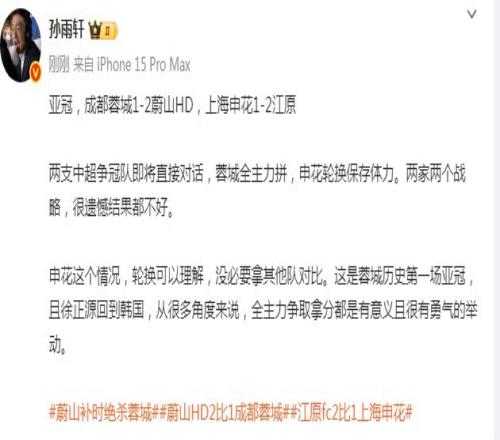 媒体人孙雨轩则表示,蓉城派主力主要是徐正源回到韩国,“两支中超争冠队即将直接对话,蓉城全主力拼,申花轮换保存体力。两家两个战略,很遗憾结果都不好。申花这个情况,轮换可以理解,没必要拿其他队对比。这是蓉城历史第一场亚冠,且徐正源回到韩国,从很多角度来说,全主力争取拿分都是有意义且很有勇气的举动。”