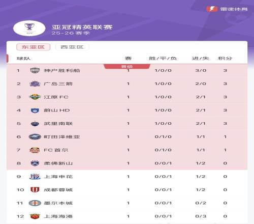 雷速体育9月19日宣 亚精英赛首轮战罢,中超3支球队均遭失利。在东亚区积分榜中,上海申花排名第9,成都蓉城第10,上海海港0-3输球后积分垫底。