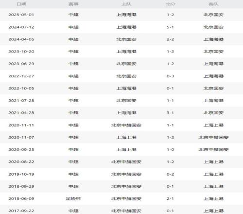 据统计,北京国安在中超主场面对上海海港已经很久没有取胜过,上一次还是2016年,随后8年连续不胜,战绩为2平6负,输过0-3、0-2、1-2、0-1的各种比分,创造主场不胜耻辱纪录。