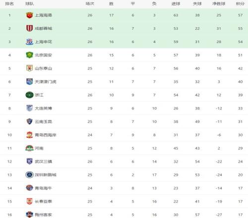 上海海港积57分,反超积55分的成都蓉城,重返榜首位置,上海申花积54分继续排名第三,北京国安终结三连败之后,积51分仍排第四位。