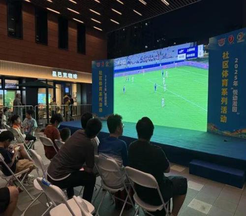 记者看到,作为一项社区体育特色活动,今年,半淞园路街道首次试水“露天足球观赛派对”,并将4米高的大屏幕安放在露天位置,出入璟湾社区的市民都可以随时看到正在进行的足球比赛,由于现场采用了高清直播信号,大屏幕逼真的观赛体验,直接将球赛的紧张气氛拉满!“申花队我也很喜欢,看到直播活动后就坐下来看一下,因为都是免费看,气氛很好的。”球迷葛先生表示。