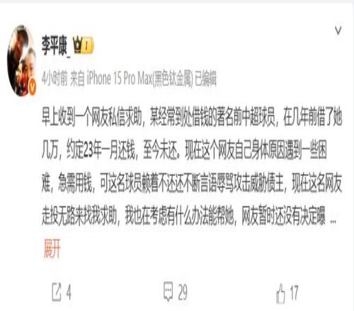 雷速体育9月29日宣 媒体人李平康在社媒爆料,某位前著名中超球员从球迷处借钱至今未还,如今当事人球迷患病急需用钱。却被球员不断言语辱骂攻击。