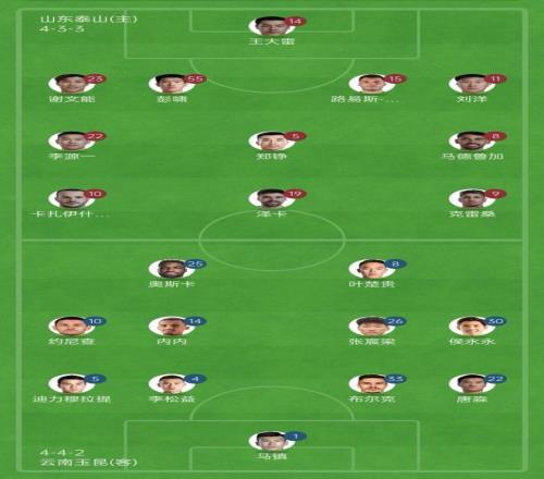 山东泰山首发:14-王大雷、5-郑铮、11-刘洋、15-路易斯-洛佩斯(F)、55-彭啸、8-马德鲁加(F)、22-李源一、9-克雷桑(F)、10-卡扎伊什维利(F)、19-泽卡(F)、23-谢文能