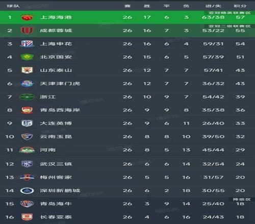 中超最新积分榜