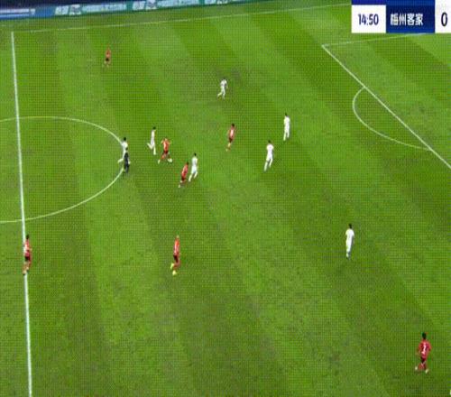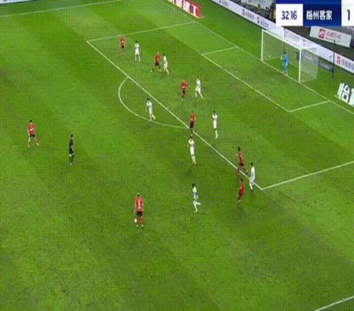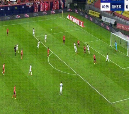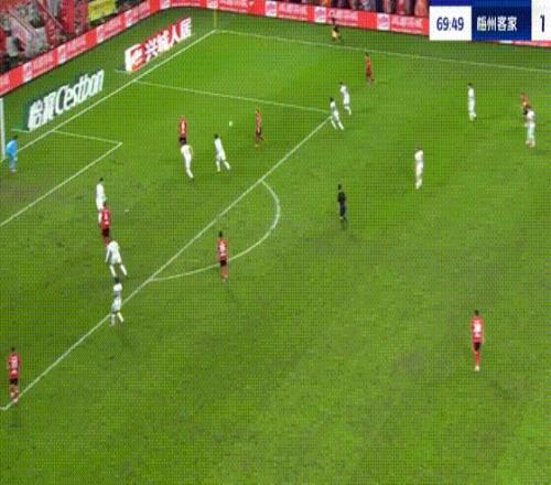 第25分钟,罗德里格带球到禁区摆脱射门,皮球打到胡荷韬变线入网,梅州客家扳平比分。