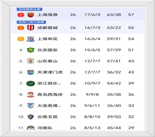 最新的积分榜上,上海海港以57分占据榜首位置,在冲冠的有利位置;