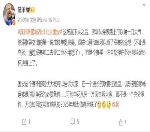 其中,记者马德兴发文表示,中超争冠,国安算是彻底洗洗睡了! 哎, 一年又一年……而记者陆洋则是表示,国安这个赛季的起伏大概可以告诉大家,在一个漫长的联赛征途里,俱乐部的顺畅运转是球队争冠的必要条件……