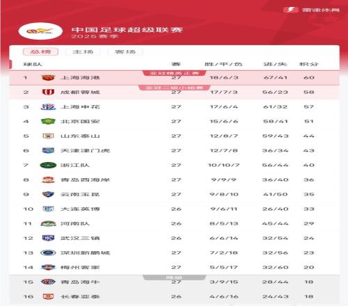 在最新的积分榜中,上海海港积60分排在榜首,领先成都蓉城2分,申花排在第三位,北京国安落后榜首9分,基本无缘争冠。