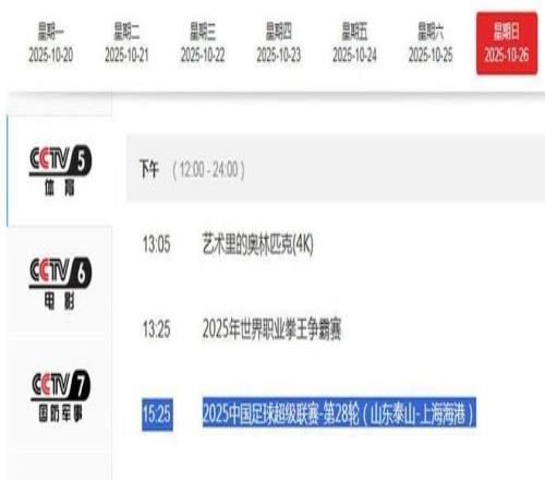 2025赛季中超联赛进入尾声阶段,争冠与保级也进入白热化,北京时间10月26日下午15:30,中超联赛第28轮将上演一场强强对话,山东泰山坐镇主场迎战上海海港!央视体育频道CCTV5将进行现场直播。此外,球迷也可通过五星体育、山东体育频道以及咪咕视频等多个网络平台观赛。