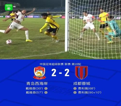 正确的战术以及运气的眷顾,青岛西海岸队坚决偷鸡踢法,上下半场各一次射正球门就收获进球,射正进球转化率达到惊人的100%。下半场,成都蓉城也积极调整基础阵型,陆续由高中锋费利佩头顶脚踢接连进球,双方最后以2比2平局收场。这场平局,也让成都蓉城错过了反超海港登顶积分榜的大好机会,不过和海港队的积分差距由2分缩小到1分。