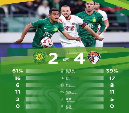 最终,北京国安主场2-4负于青岛海牛。