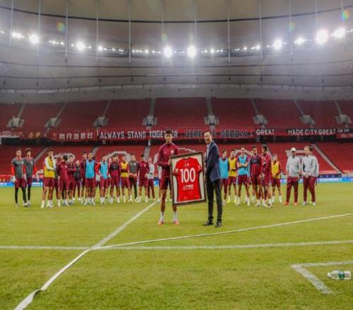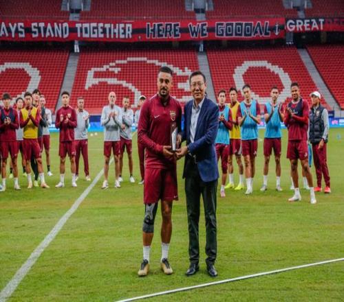在中超联赛第 25 轮海港队客场对阵北京国安的比赛中,莱昂纳多上演 “帽子戏法”,帮助球队赢得胜利。凭借这一优异表现,他获评当轮最佳球员。在中超联赛第 26 轮的比赛中,海港队员李帅迎来了他代表俱乐部出战各项赛事的第 100 场比赛,解锁其个人百场里程碑。昨天的赛前训练开始前,俱乐部总经理沙良昌为莱昂纳多颁发第 25 轮最佳球员奖杯,为李帅赠送百场纪念球衣。