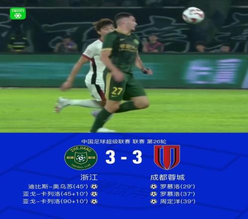 中超第26轮,成都客场面对浙江队,40分钟即取得3-0领先,但浙江队在半场结束前就追回两个,卡列洛在第100分钟压哨完成绝平。同时进行的比赛,莱昂纳多几乎也是在压哨阶段绝杀三镇,海港反超登顶。
