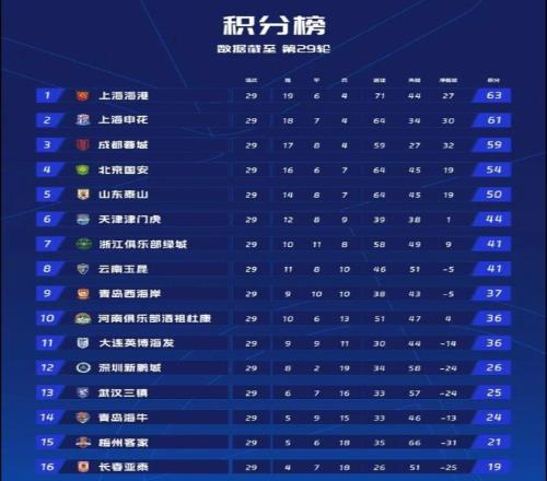 最新积分榜,海港前29轮19胜6平4负积63分高居榜首,申花多平一场以2分只差排名第二。