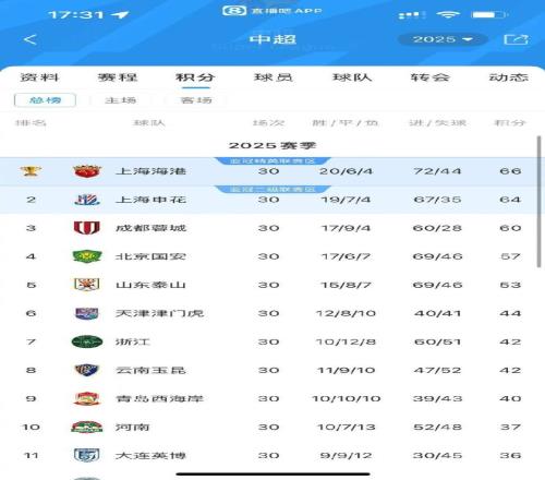 今天下午,2025赛季中超第30轮比赛开启,上海海港在客场1比0击败大连英博,上海申花在客场3比1取胜天津津门虎,最终海港20胜6平4负积66分获得本赛季冠军,并实现自2023赛季以来中超三连冠,申花积64分连续第二年获得中超亚军。中超冠军也连续三年归属上海。