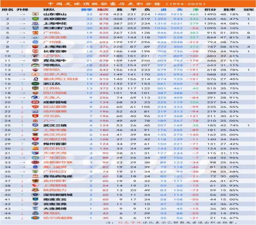 1、 统计数据自1994赛季至2025赛季,合计32年,不分甲A和中超。1994赛季采用2分制,其余赛季均为3分制。