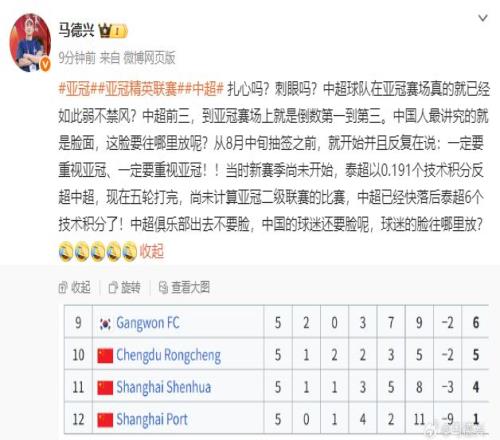 “从8月中旬抽签之前,就开始并且反复在说:一定要重视亚冠、一定要重视亚冠!!当时新赛季尚未开始,泰超以0.191个技术积分反超中超,现在五轮打完,尚未计算亚冠二级联赛的比赛,中超已经快落后泰超6个技术积分了!中超俱乐部出去不要脸,中国的球迷还要脸呢,球迷的脸往哪里放?”