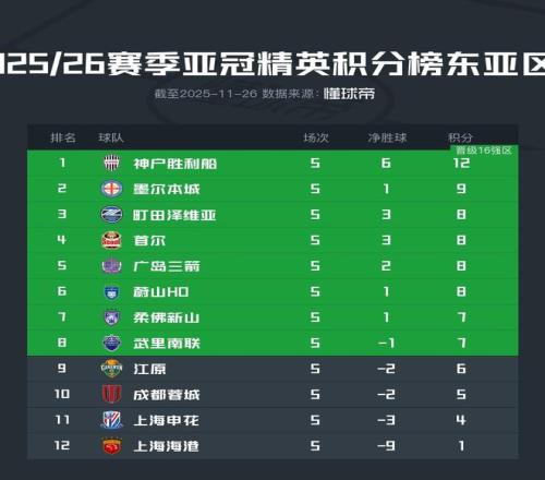 亚冠精英联赛5轮过后,神户胜利船积12分领跑。中超三支球队继续排在积分榜垫底的位置,上海海港5轮积1分垫底,上海申花积4分倒二,成都蓉城积5分倒三。