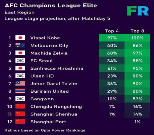 最新出炉的晋级排行榜(上图)显示,刚刚击败申花的神户胜利船已经100%确定可以晋级到亚冠16强,全部东亚区12支球队的晋级排名从高到低依次为:神户胜利船、町田泽维亚、广岛三箭、柔佛新山、首尔FC、墨尔本城、蔚山现代、武里南联、江源FC、成都蓉城、上海申花、上海海港。