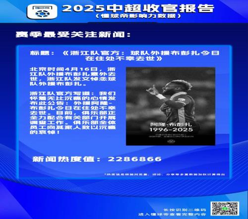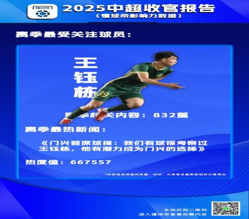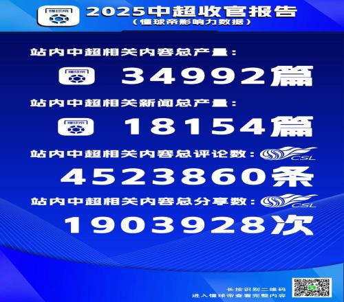 2025赛季中超联赛已经落下帷幕,一年一度的《懂球帝中超收官报告》正式跟大家见面啦。今年,我们将从懂球帝影响力数据、赛事基础数据以及中超MVP相关数据三个方面,来为您呈现这一整个赛季中超的盛况。