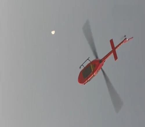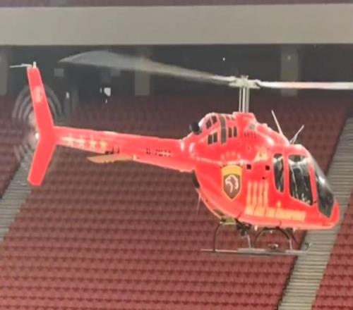 庆典最激动人心的时刻出现在直升机送火神杯环节。从视频中看到,一架直升机突然盘旋在现场的上空,然后徐徐降落在现场中央。