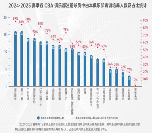 其中,浙江的注册球员中自家青训培养的有16人,占比高达89%排第一;
