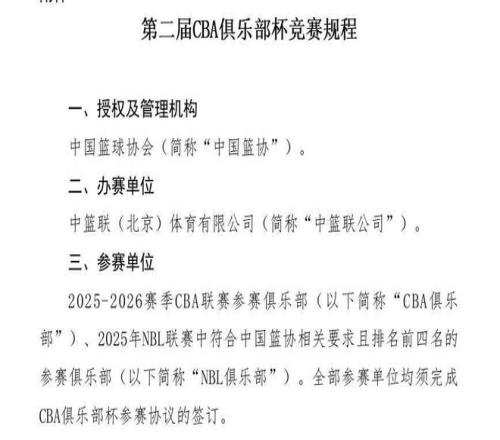 就在刚刚,篮协方面发布了《中国篮球协会关于印发第二届CBA俱乐部杯竞赛规程的通知》,第二届CBA俱乐部杯计划在2025年12月3日至2026年2月12日期间举行,请各有关单位遵照执行,并按照竞赛规程要求,有序组织各项参赛工作。按照参赛规则,参加CBA联赛2025-26赛季的20支球队全部参加CBA俱乐部杯赛,另外还有2025年NBL联赛常规赛的前4名也将参加,这次一共是24支球队参加比赛。这也将成为未来CBA扩军的尝试或者是一个模板。