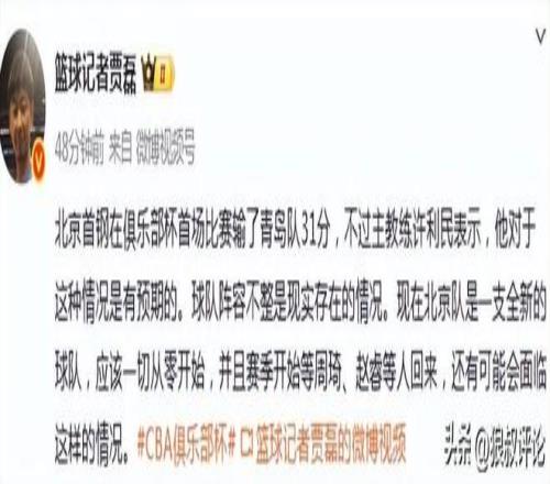 赛后,许利民谈到北京男篮输31分的相关话题表示:这种情况是有预期的。球队阵容不整是现实存在的情况。现在北京队是一支全新的球队,应该一切从零开始,并且赛季开始后周琦、赵睿等人回来,还有可能会面临这样的情况。