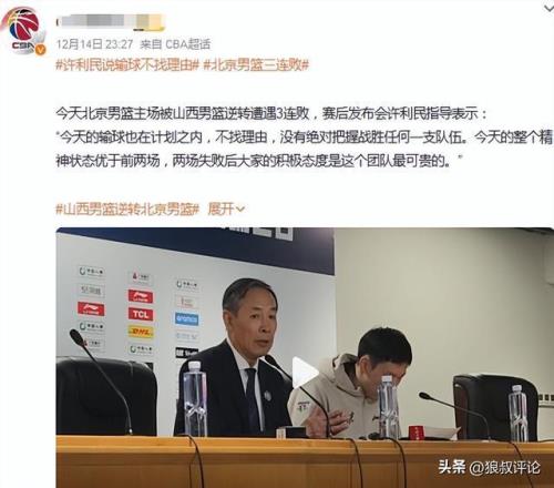 上赛季,北京男篮短时间内遭到山西双杀,以及不敌广东的新闻发布会,许利民的采访提到三连败仍在计划内。