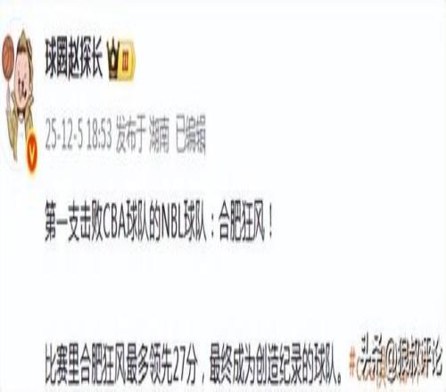 北京时间12月5日,CBA杯赛继续开打,合肥狂风100-80击败江苏肯帝亚。成为NBL球队当中,首支在正规比赛击败CBA球队的队伍,创造历史性时刻。