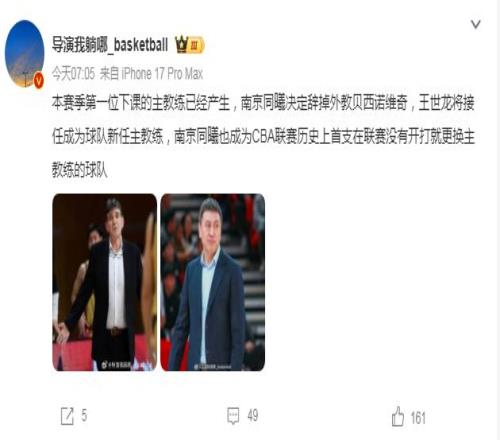 北京时间12月9日,2025-26赛季的CBA新赛季尚未开始,如今根据国内媒体与媒体人报道,因为在CBA俱乐部杯表现不佳与难以有效调整,同曦男篮洋帅贝西洛维奇将被辞掉,前浙江男篮获得过最佳主教练奖的王世龙将接任成为主教练,同曦男篮成为CBA历史首支在新赛季尚未开始就换帅的球队。