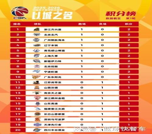 CBA常规赛第1轮比赛全部战罢,随后最后三场比赛结束,广东队、宁波队以及上海队分别击败对手,拿到赛季开门红。而在广东、宁波以及上海三支球队拿到首胜后,CBA积分榜也发生了微妙的变化。目前,CBA积分榜上,卫冕冠军广厦依旧稳居第一位,北京队和广州队分居第2和第3,而辽宁队则排在第4名。这一轮比赛赢球后,上海队杀进了第6名,11冠王广东队则排在了第10名。