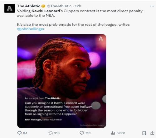 根据TA记者John Hollinger的分析,宣布伦纳德的合同无效对于NBA而言是非常棘手的问题,既要作废合同又要让快船承担工资帽惩罚的解决方案很难成为最终的结果。